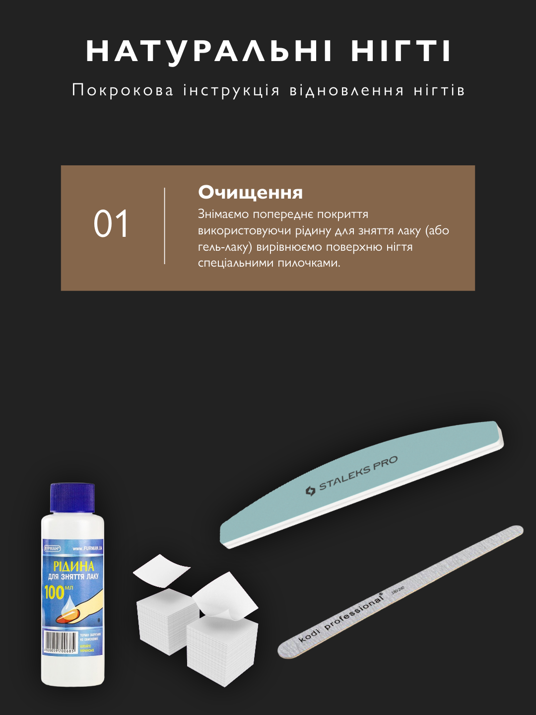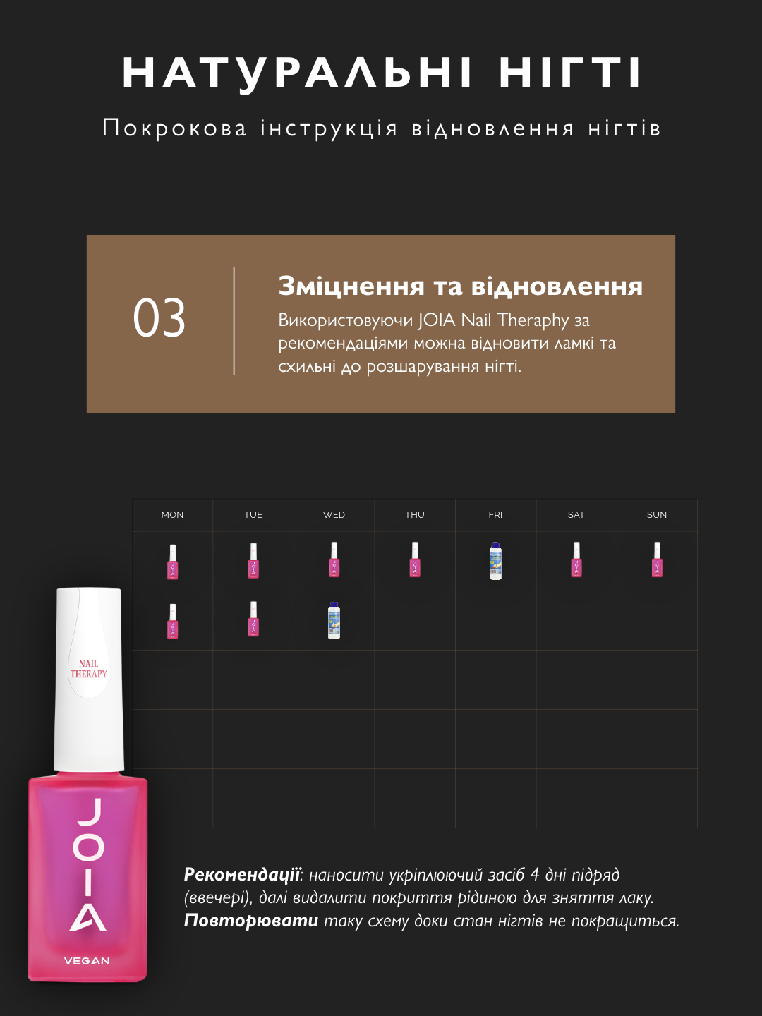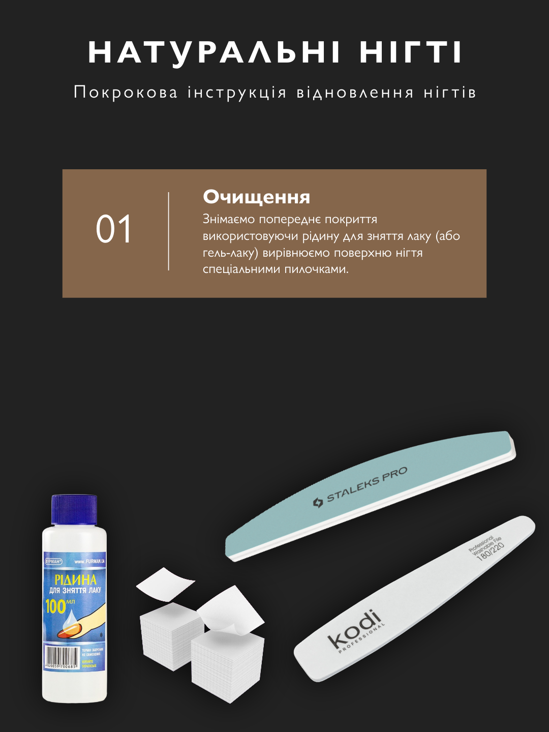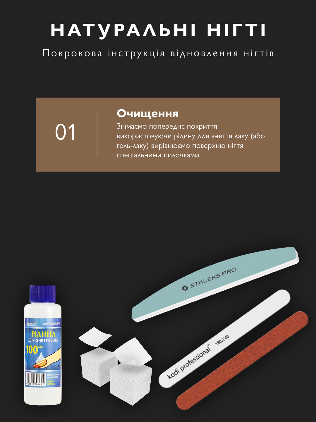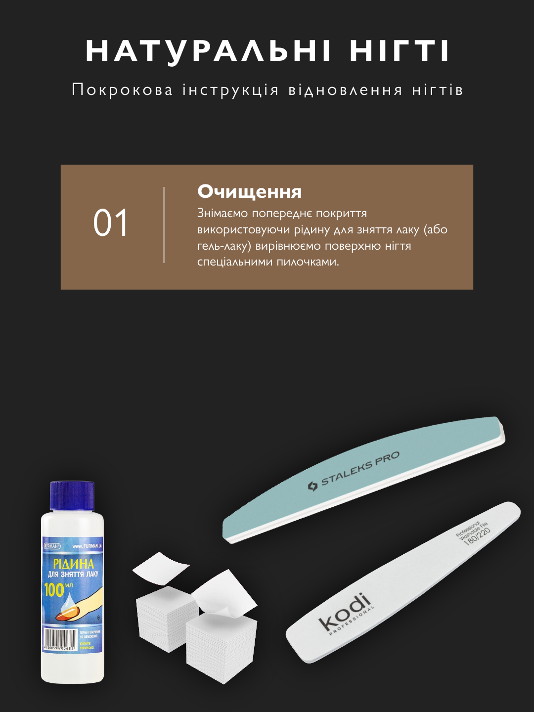 Від зняття покриття до зволоження кремом. Нігті набувають блиску за 10 днів.