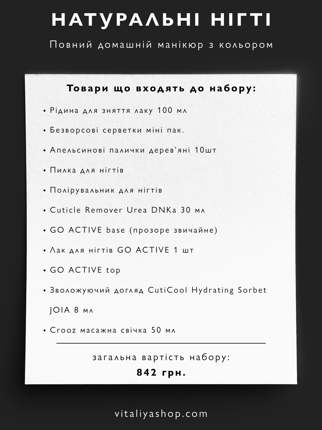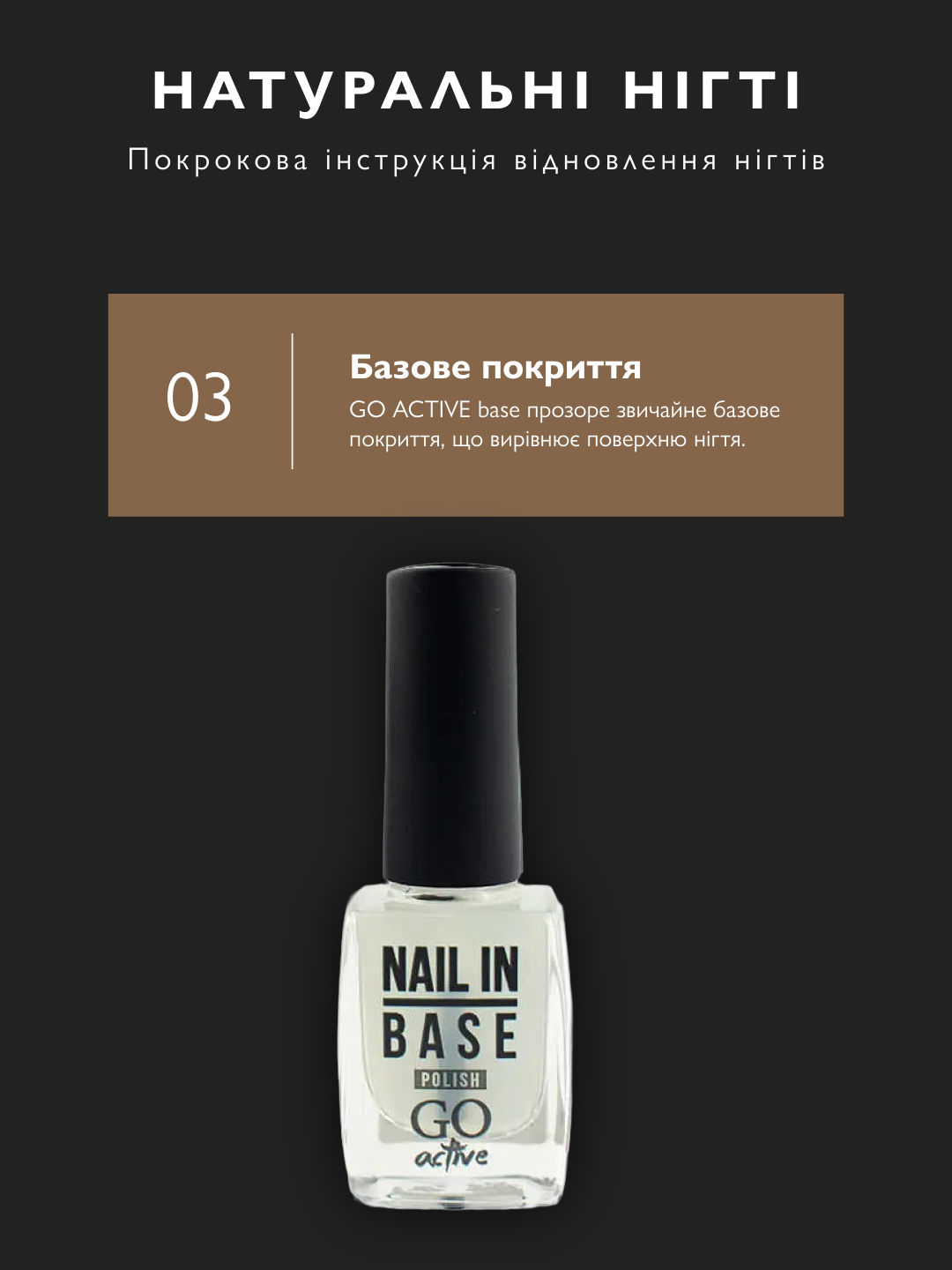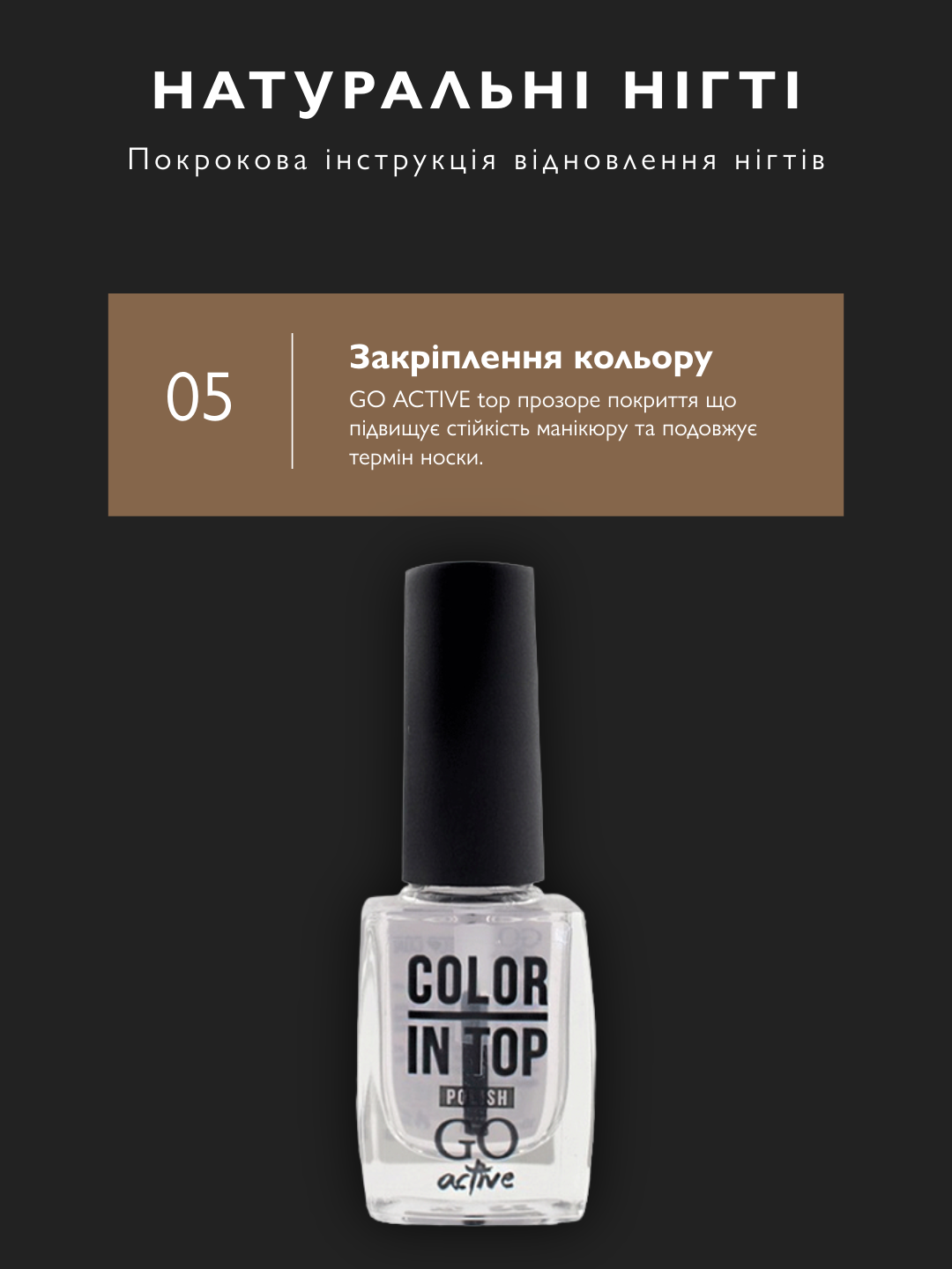 Домашній манікюр з кольором: набір з GO ACTIVE base, лаком і топом. Тримається 7–10 днів, зміцнює нігті.