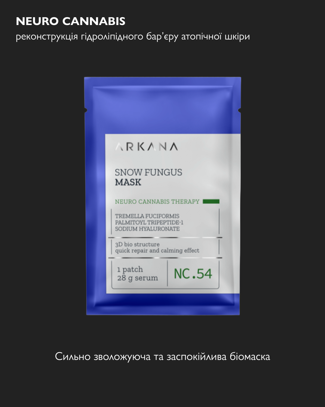 NEURO CANNABIS Натуральна біомаска, до її структури входить білий сніжний гриб (Tremella fuciformis). Завдяки полісахаридам, що містяться в грибі, володіє сильними заспокійливими і глибоко зволожуючими властивостями, створюючи захисний шар на сухій і подразненій шкірі. Крім того, маска містить високу концентрацію гіалуронової кислоти, вітамінів С та Е, а також пептиду PAL-GHK для більш швидкої регенерації шкіри. Маска готова до використання як в домашніх умовах, так і в салоні.