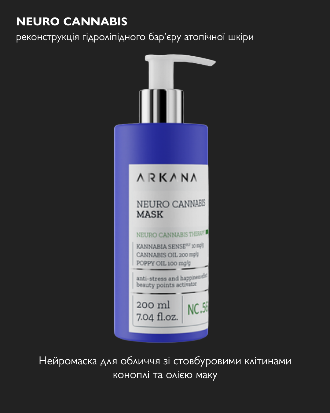 Відновлююча маска крем. Містить 40% активних компонентів. Багата на корисні жирні кислоти. Містить інноваційний активний інгредієнт Kannabia Sense та 30% конопляної олії та олії насіння маку.