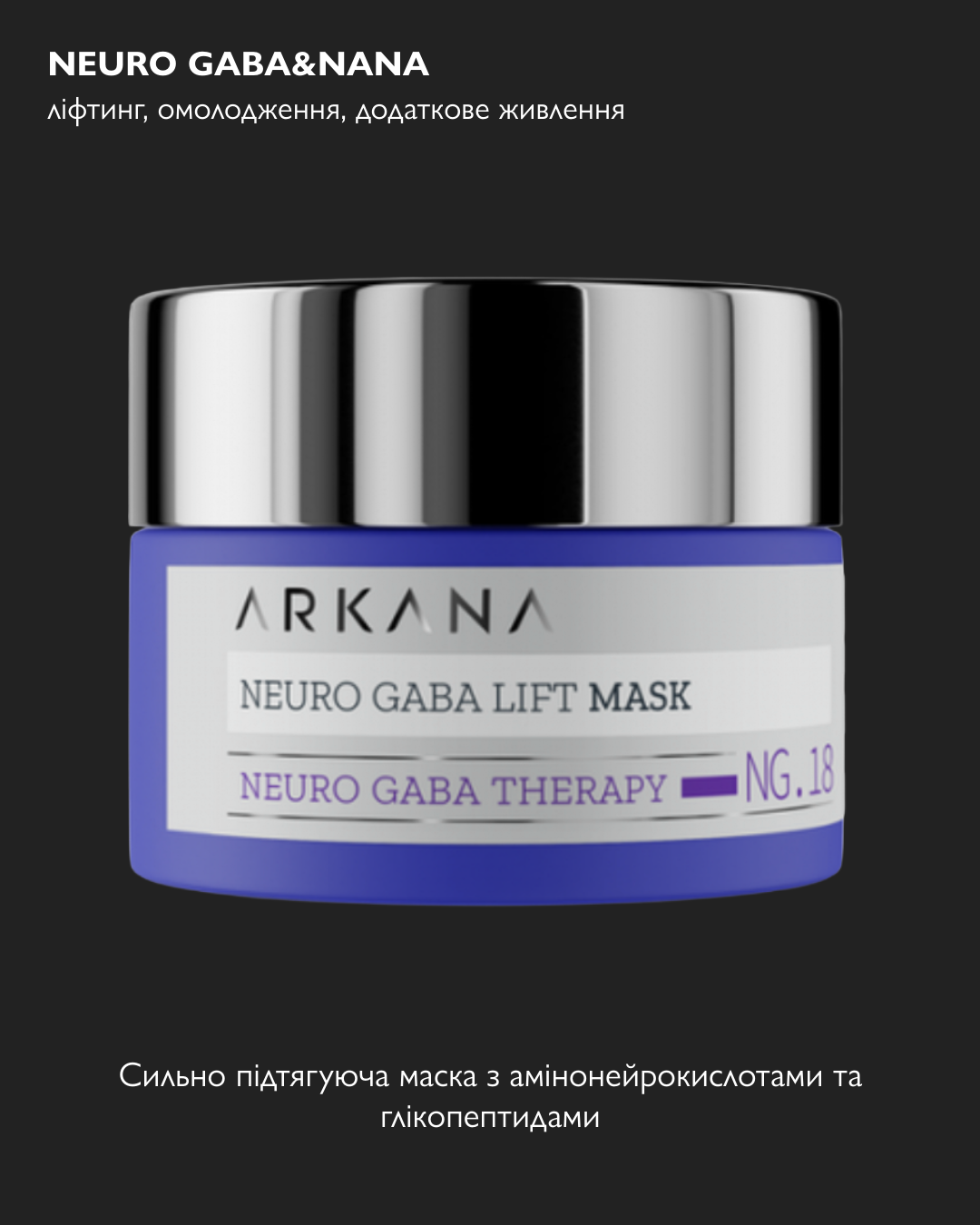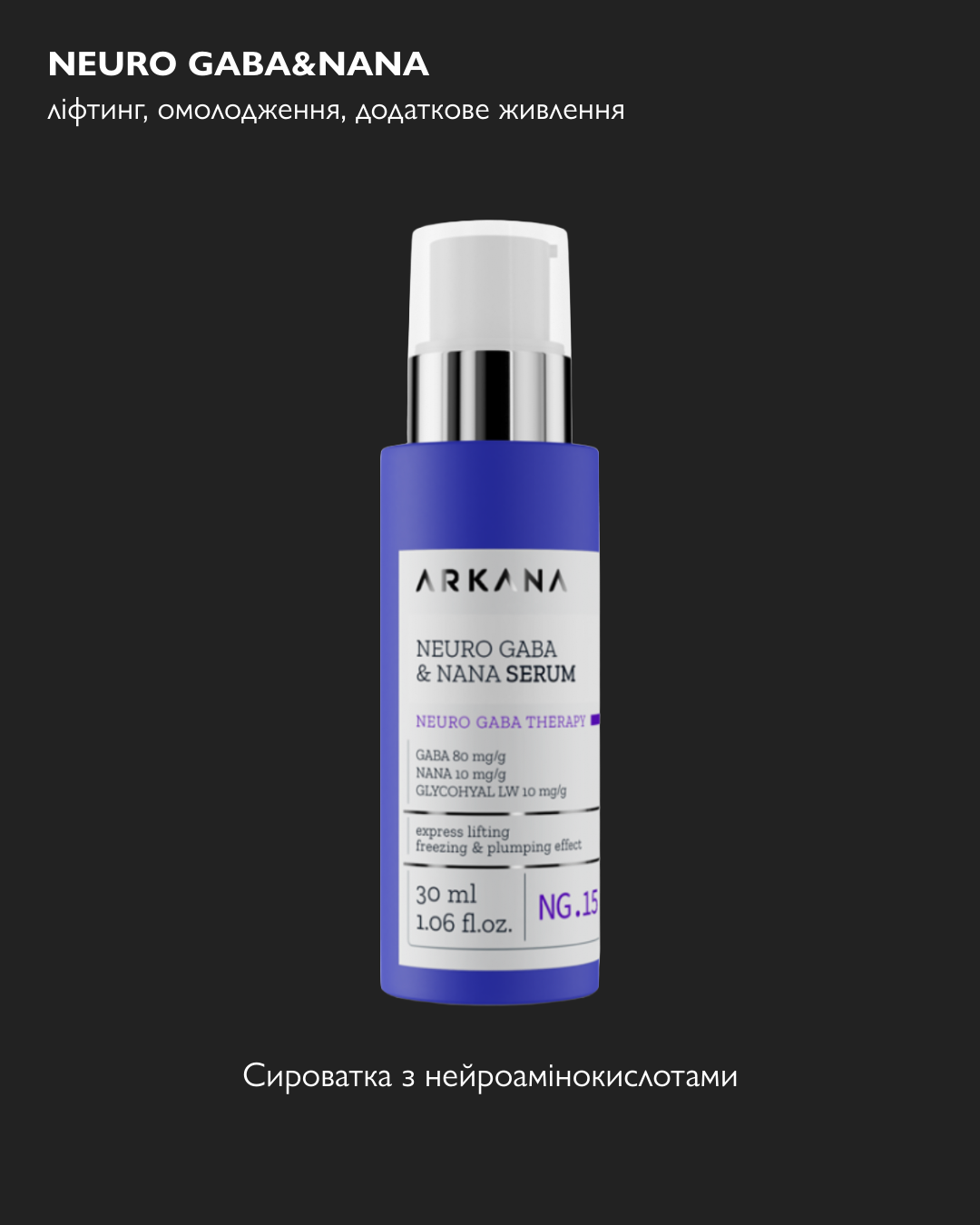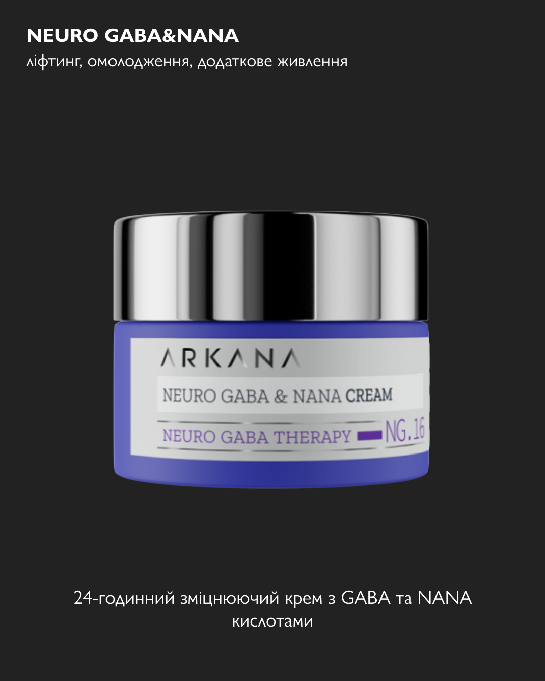 NEURO GABA&NANA Цей 24-годинний крем – один із найпопулярніших продуктів Arkana, який завоював безліч нагород. Має легкий склад та розкішний аромат. Містить 10% активних речовин: GABA та NANA, гіалуронову кислоту та глікогіал LW.