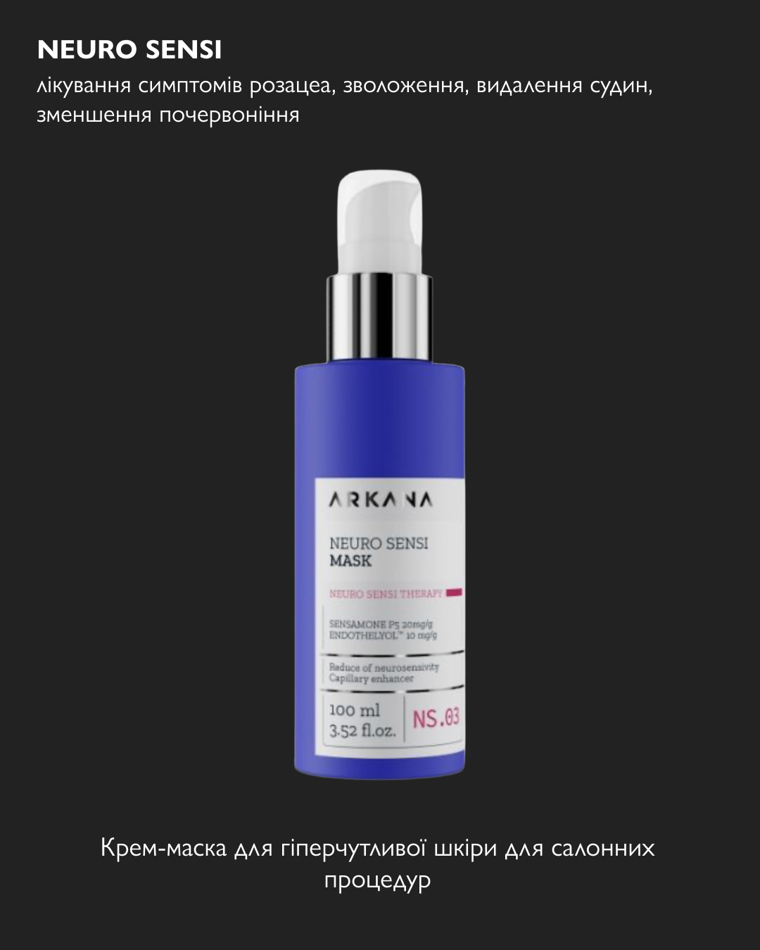 З біоактивними речовинами, підходить для всіх типів шкіри. Регулює вологість шкіри та відновлює кислотно-лужний баланс. Збільшує проникність у шкіру активних інгредієнтів з наступних етапів догляду. Не впливає на захисний бар’єр шкіри. Допомагає блокувати синє світло та радіацію. Захищає клітини від пошкоджень. Сумісний з усією продукцією Arkana. Без запаху. Містить 3% біоактивних інгредієнтів: 12 різних амінокислот, пантенол, рослинний гліцерин, гіалуронову кислоту.
