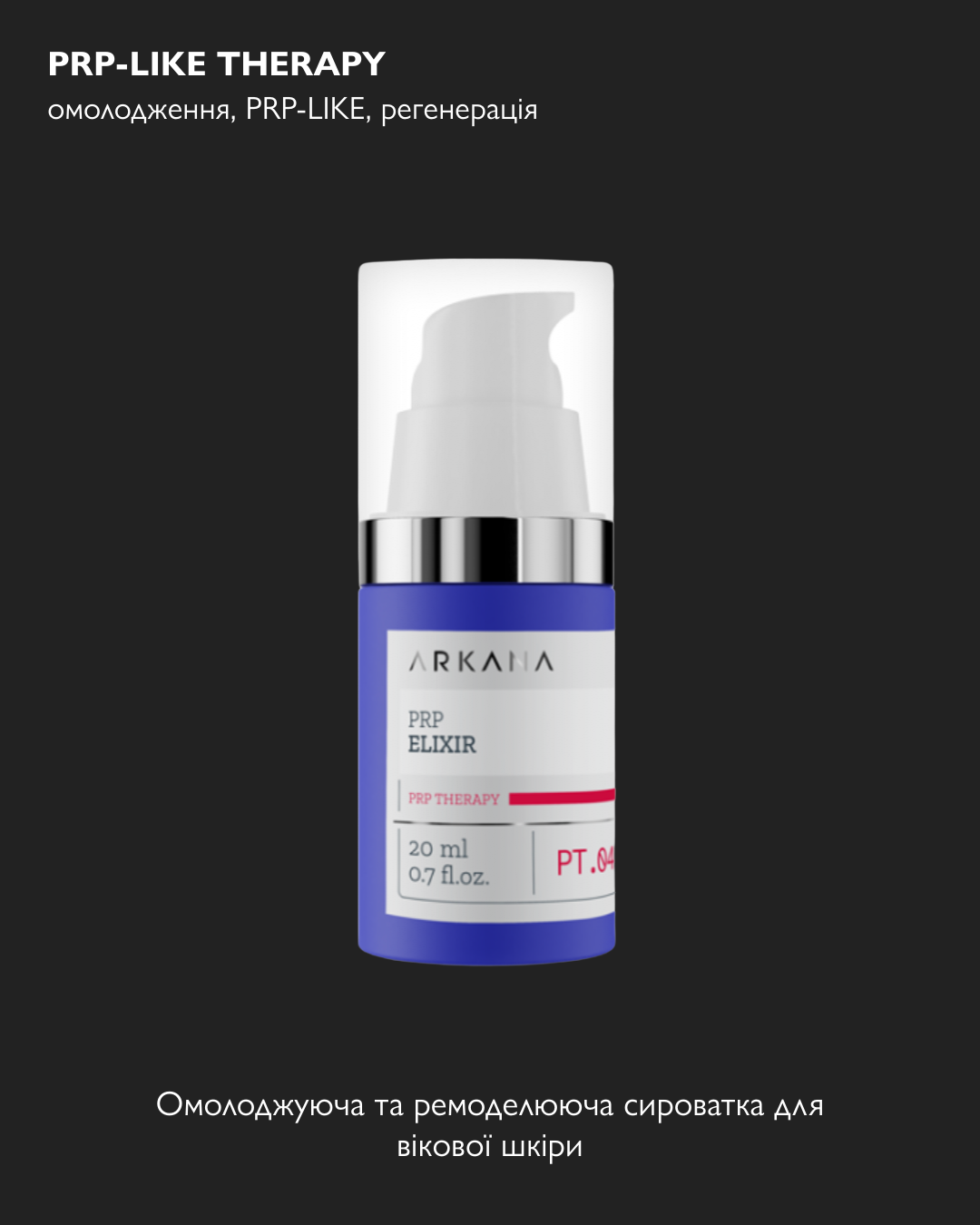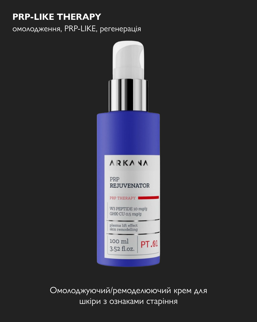 PRP-терапія, запропонована компанією Arkana, є чудовою альтернативою ін’єкціям, що імітують процедуру плазмоліфтингу. У продуктах використовуються два сигнальні пептиди: W3 і GHK-Cu. Крім того, крем містить олію насіння чиа, мигдальну олію, олію горіхів інка, олію бабасу, вітамін Е. Активні інгредієнти стимулюють оновлення шкіри, відновлюють її. Повертають назад процес старіння. Крем має приємний запах та легкий склад. Ідеальна база під макіяж.
