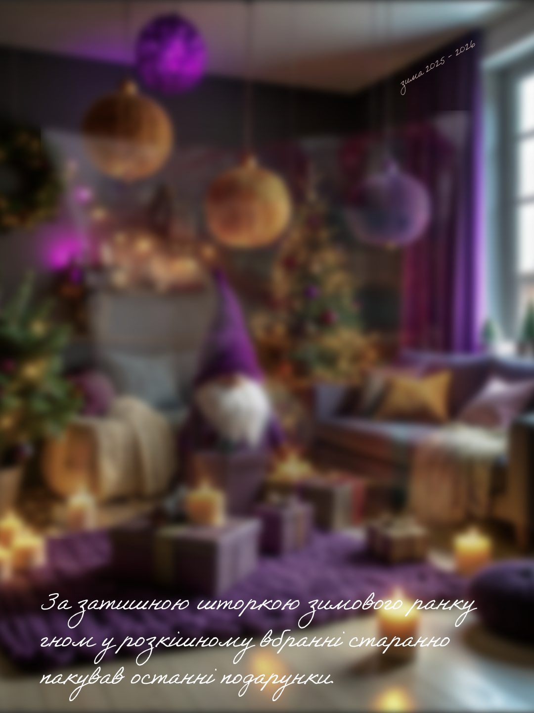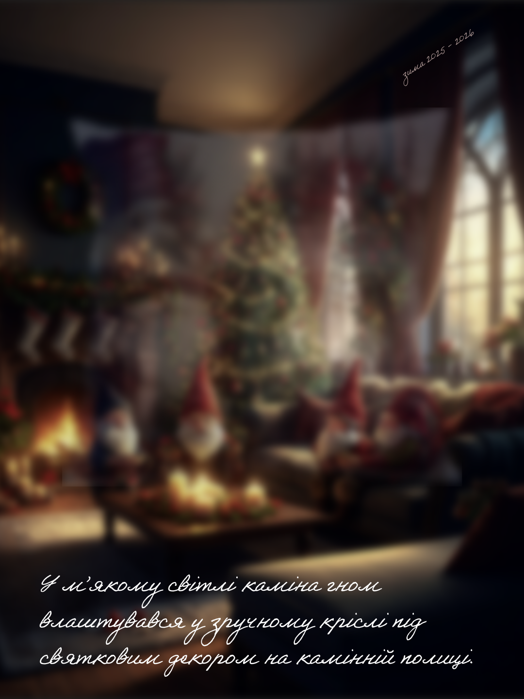 На м’якій зимовій хмаринці гном милується зоряним небом і казковим краєвидом засніженого містечка. Він споглядає, як у кожному віконці палає приглушене світло, а співи вечора огортають простір тихою благодаттю. У цьому спокої народжуються нові мрії й мудрі побажання для всіх мешканців казкової країни. Бо зима — час для натхнення, тиші і гармонії у кожній миті.