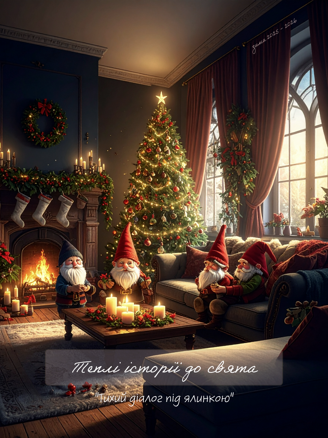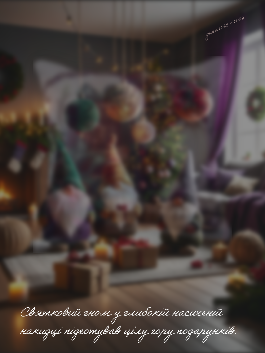 Коли вечір наближається до Святвечора, гном у затишній червоній шапці підходить до прикрашеної ялинки. Його погляд затримується на золотих вогниках, у серці пульсує легка захопленість, а в повітрі — аромат кориці й мандарин. Він обережно підвішує останню іграшку, символ турботи про кожного у домі. Цей момент нагадує: справжнє щастя — це бути разом і наповнювати простір світлом своїх почуттів.