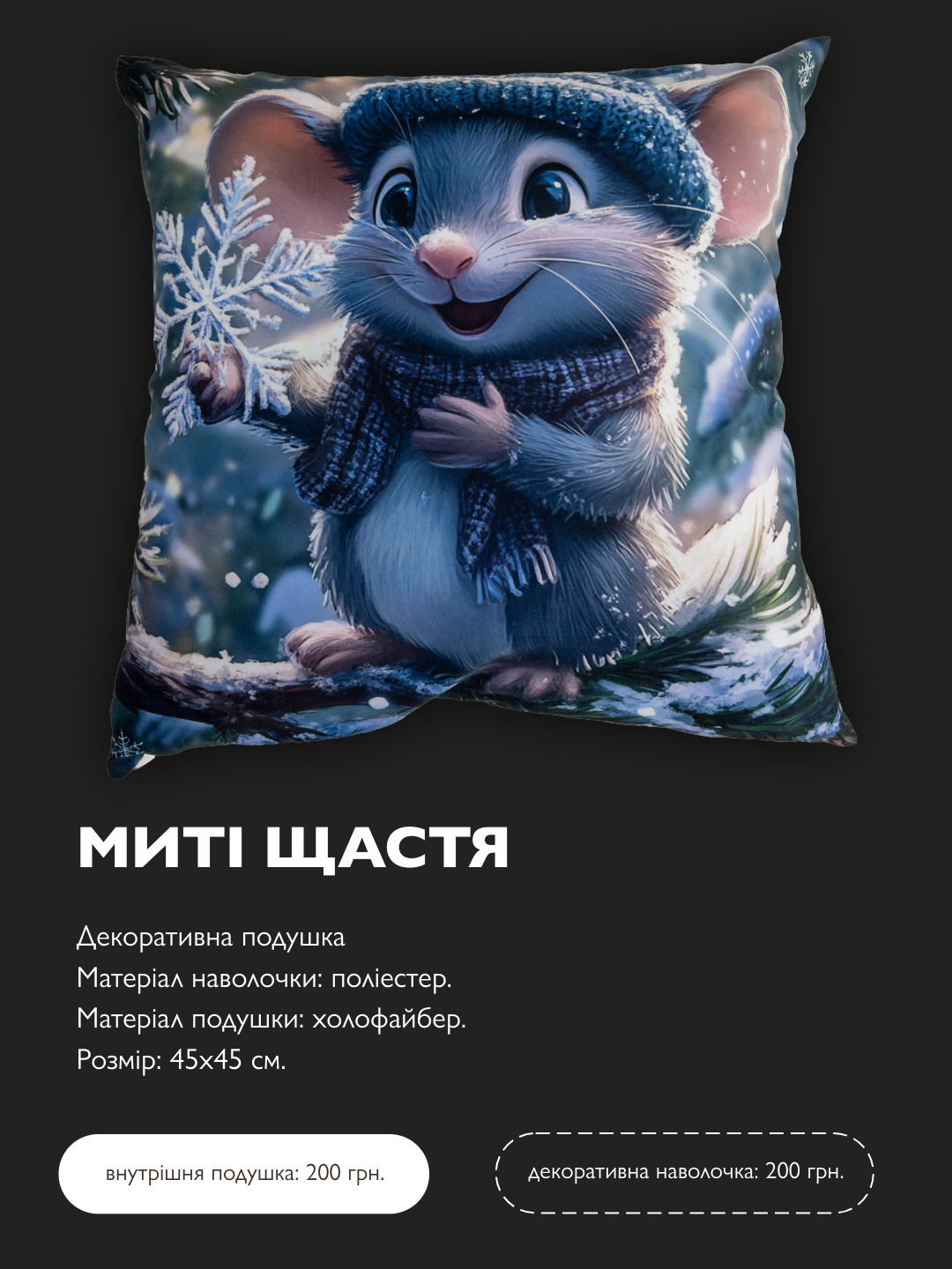 Тепла усмішка, закутана в м’яку шапочку, народилась у цьому мишеняті саме у момент, коли сніжинка ніжно торкнулася долонь. Його щастя було простим та безмежним — у турботі про себе, у вдячності світу за кожен новий день. Казкова зима навчала його знаходити радість у дрібницях і підтримувати віру у світло за вікном.