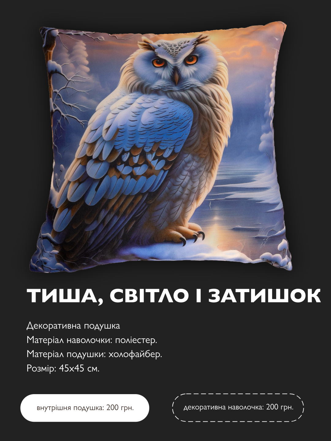 Посеред снігової казки святої ночі, ця сова спостерігає за сімейними обрядами, вдихає морозне повітря і охороняє дім від зайвого галасу. Її проникливий погляд — про мудрість рішень і турботу про найближчих.