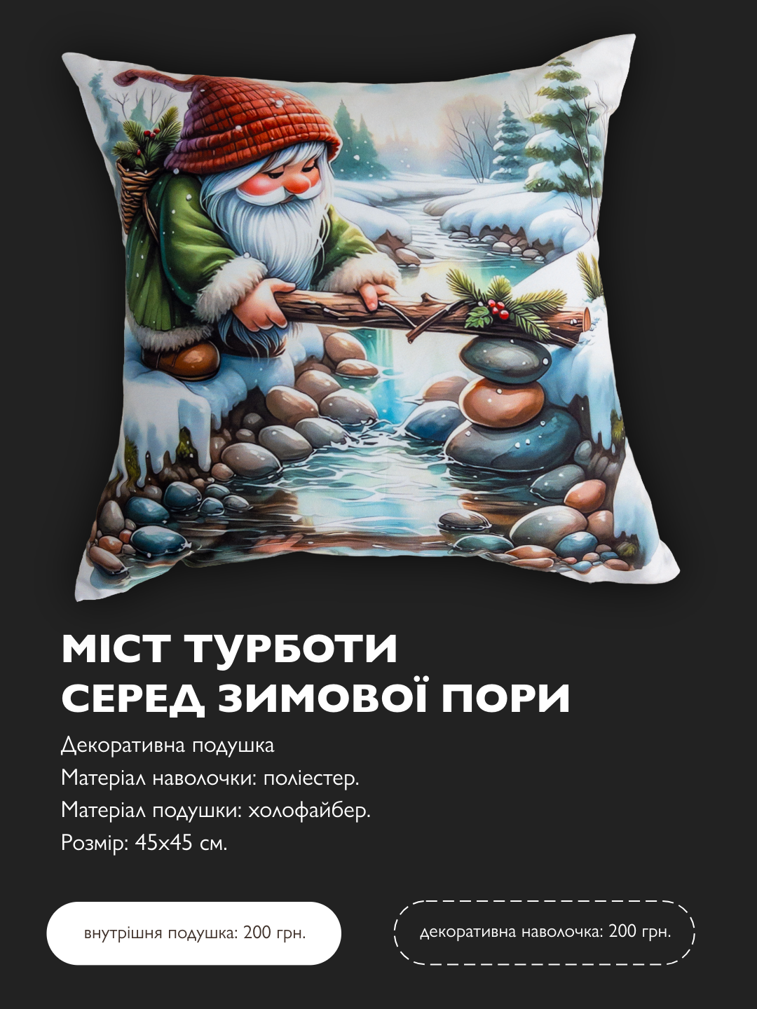У гнома з м’якою бородою та теплою шапкою в руках — легке вужичко, яким він розгортає невеликий міст над кришталевим потічком. Його зусилля — це символ щоденної турботи, бажання будувати зв’язки, навіть якщо холод відчувається гостріше. А поруч із ним, у тиші природи, народжується нове відчуття дому й впевненість — з добром у серці, жодна зима не страшна.