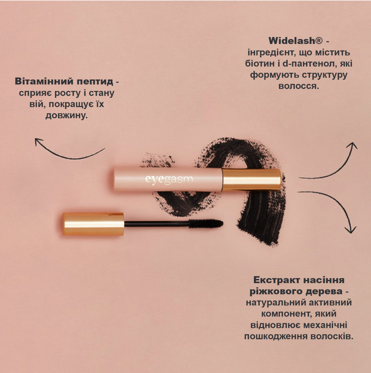 Аргінін: амінокислота, що підтримує синтез кератину, важливого для регенерації і реконструкції вій. Допомагає зміцнити вії і покращити їх стан.