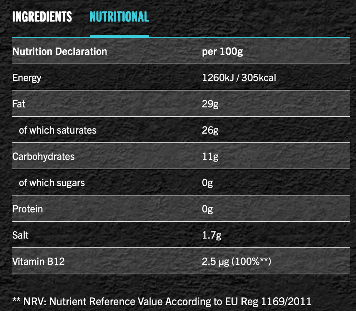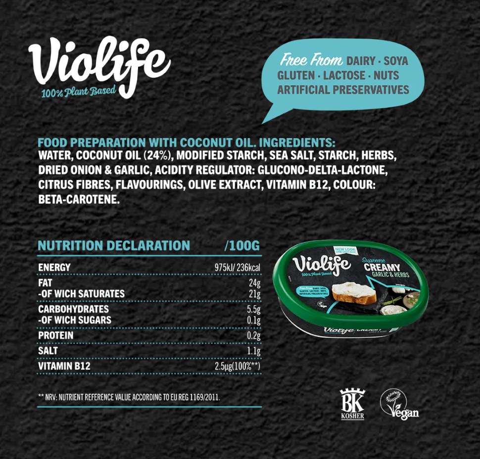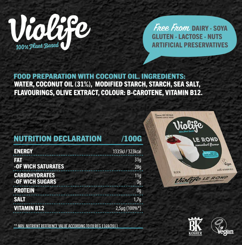 (Filtered Water, Coconut Oil, Food Starch-Modified (Tapioca & Potato), Potato Starch, Salt (Sea Salt), Fructose, Cheddar Flavor (Vegan Sources), Calcium Phosphate, Lactic Acid, Black Salt (Salt, Herbs), Olive Extract, Paprika Extract & Beta Carotene (Color), Vitamin B12.)