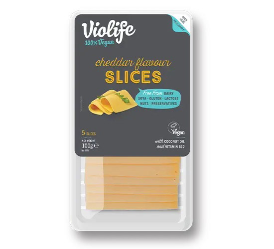 Рослинний традиційний сир Vio Life Слайс Cheddar (Чеддар) Склад: Вода, кокосова олія (23%), Крохмаль, Морська сіль, Чеддер, Оливковий екстракт, Колір: (екстракт паприки, B-каротин), вітамін B12.