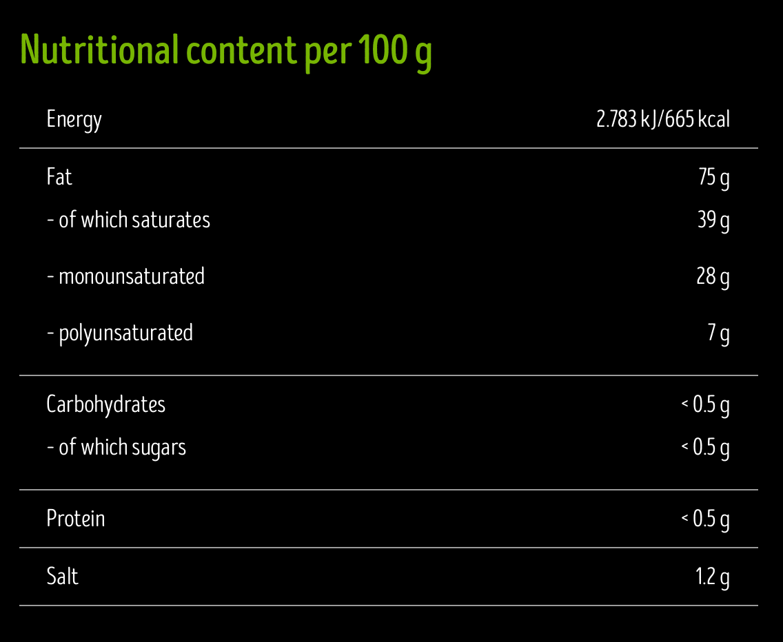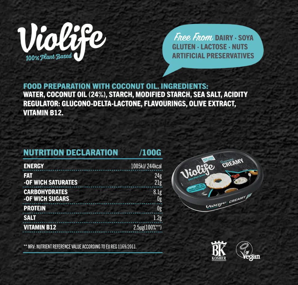 Склад: Вода, Кокосова олія (21%), Крохмаль, Морська сіль, Моцарелла, Екстракт оливи, Колір: B-каротин, Вітамін B12.